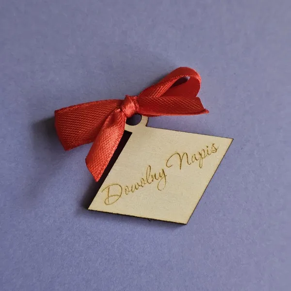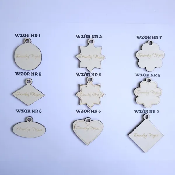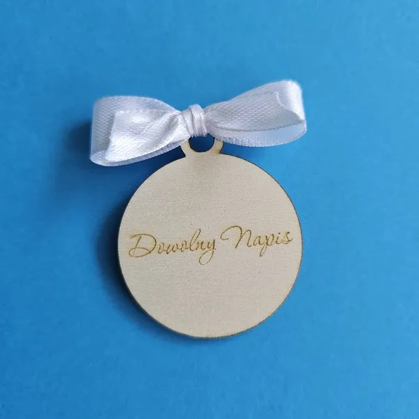 Kotylion drewniany. Grawerowany laserowo Dowolny Napis do 5 słów + liczba, wycięty laserowo kotylion w jednym z 7 wzorów..