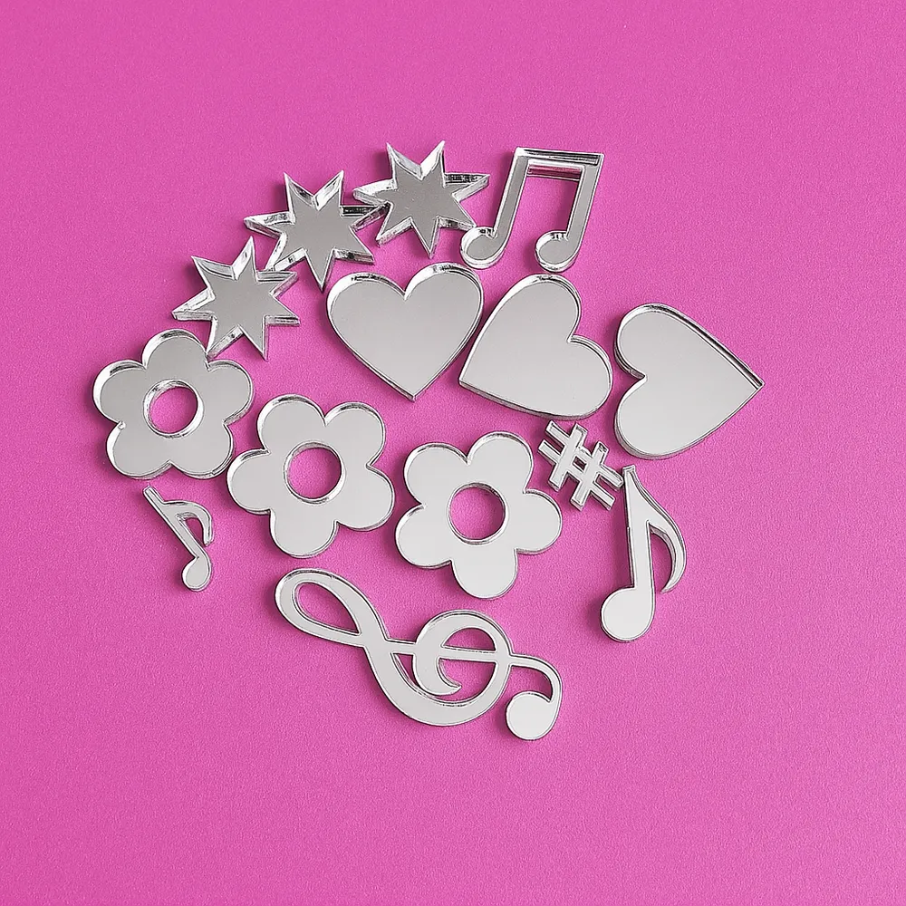 Aby stworzyć wyjątkowe dekoracje, użyj mixu ozdób takich jak kwiatki, gwiazdki, serca i nuty.