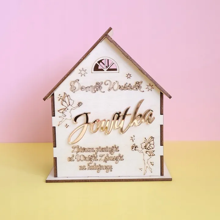 Personalizowana skarbonka Domek Wróżek. Napis „Domek Wróżek” + symbole: gwiazdki, wróżki + imię + dowolny napis personalizowany. Puzzle 3D.