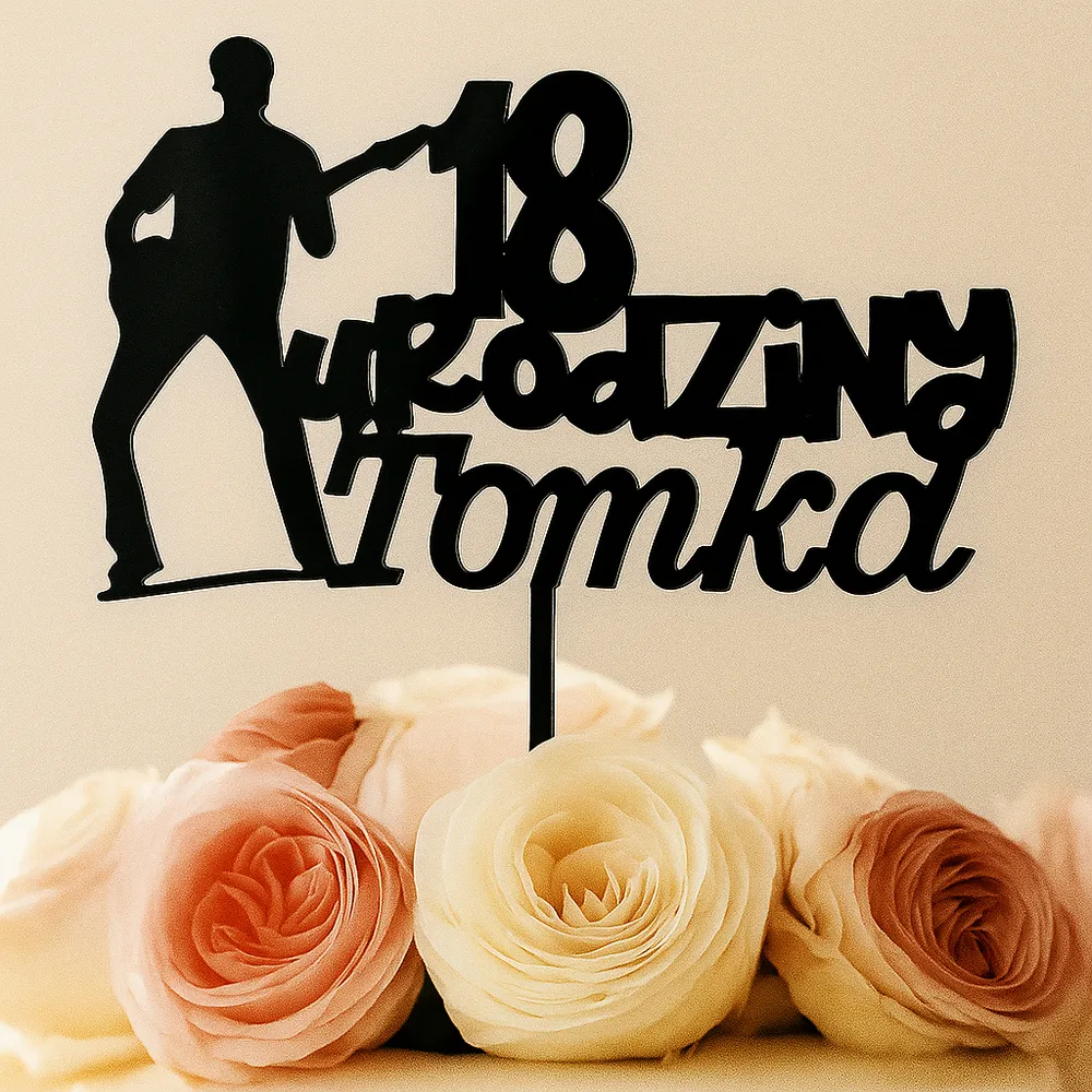 Wyjątkowy topper urodzinowy z dynamiczną sylwetką gitarzysty to idealna dekoracja tortu dla fana muzyki rockowej, metalowej, bluesa – lub po prostu pasjonata gitary. Imię jubilata oraz liczba lat wkomponowane w kompozycję z napisem „urodziny” tworzą efektowną całość, która będzie mocnym akcentem podczas przyjęcia.