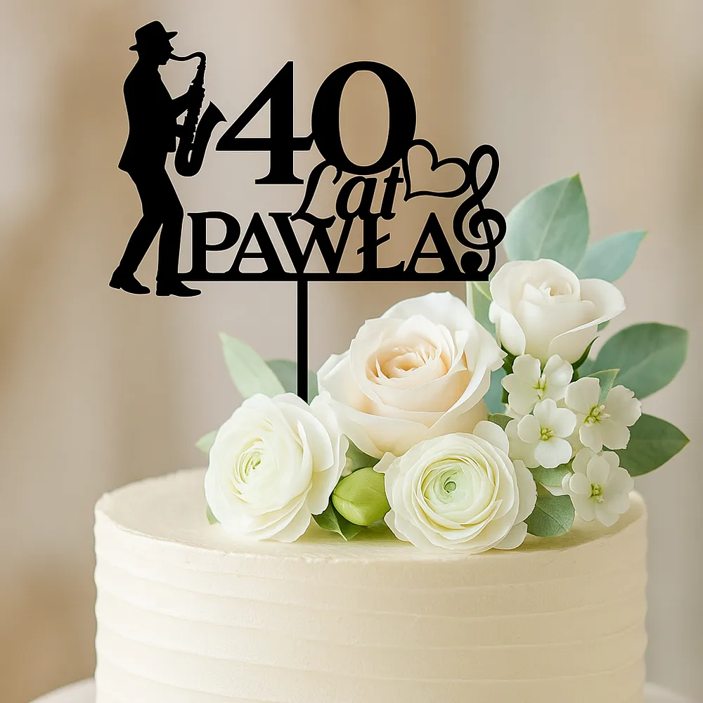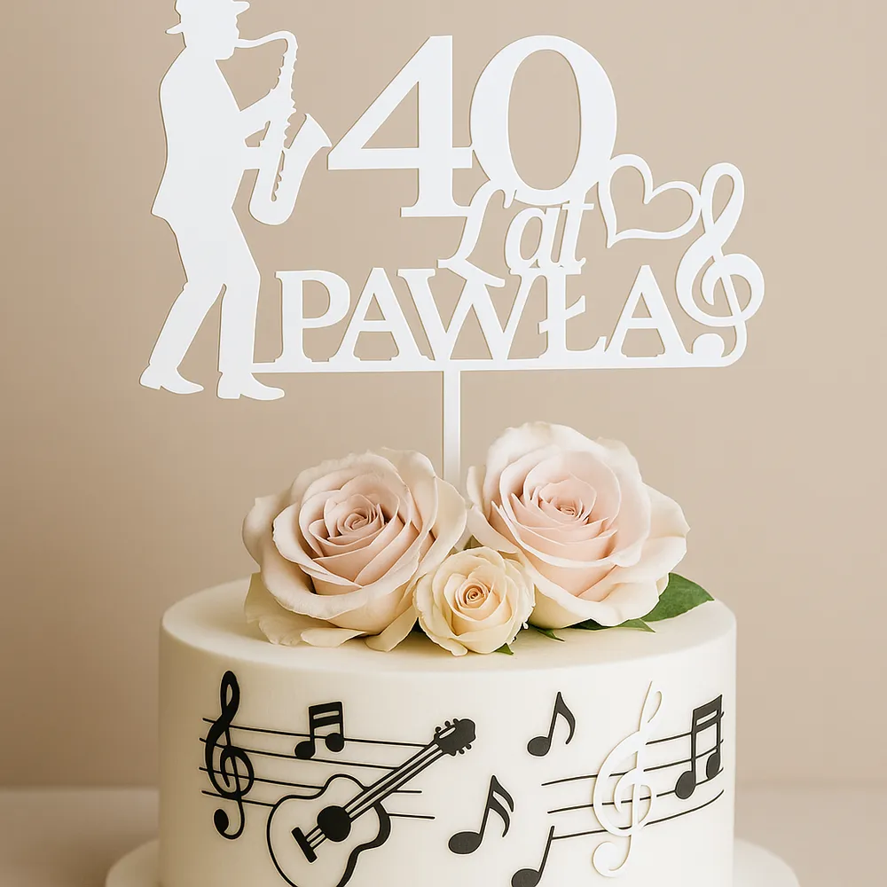 Stylowy topper urodzinowy z dynamiczną sylwetką saksofonisty to doskonała dekoracja tortu dla każdego miłośnika muzyki. Połączenie eleganckiego wzoru, klucza wiolinowego, serca i imienia jubilata tworzy wyjątkową kompozycję, która podkreśli charakter uroczystości. Topper muzyczny z saksofonistą to także doskonały wybór na przyjęcie urodzinowe.